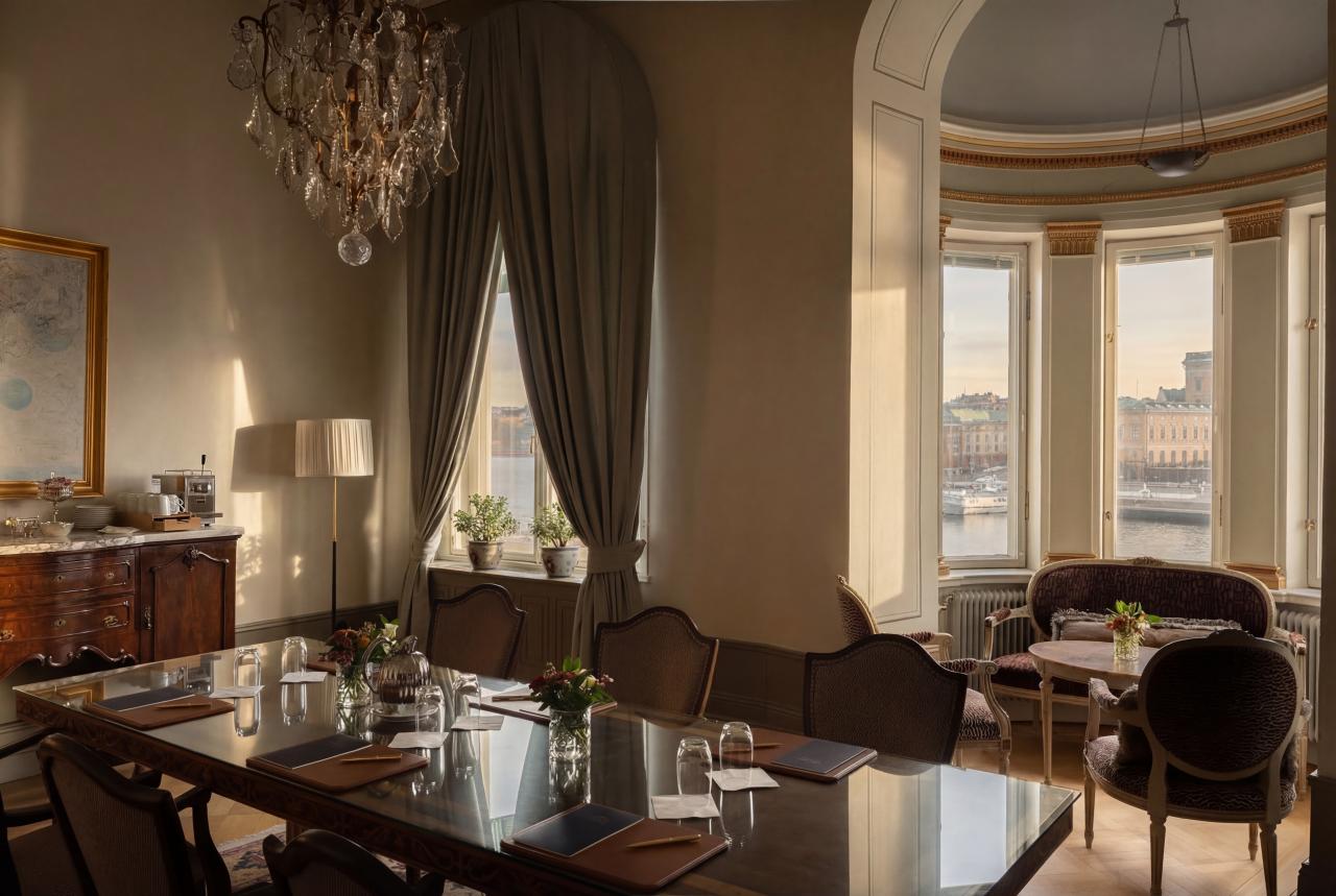 Genom fönstren i burspråket strömmar ljuset in. Det här är en trevlig lokal för ett mindre sällskap, men om festen eller konferensen kräver mer plats finns det fem andra rum att komplettera med på samma våning; Thavenius salong, Zetterwallska salongen, Carl Larsson rummet och Bolinderska rummet.